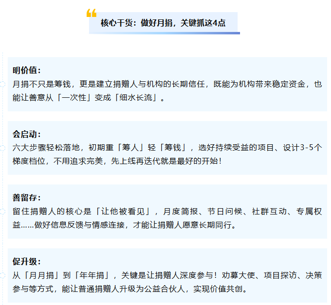 本次直播,兰廷双理事长从月捐核心价值、落地步骤到拉新留存、升级转化,把月捐从0到1的关键心法一次性讲透,核心干货速览。