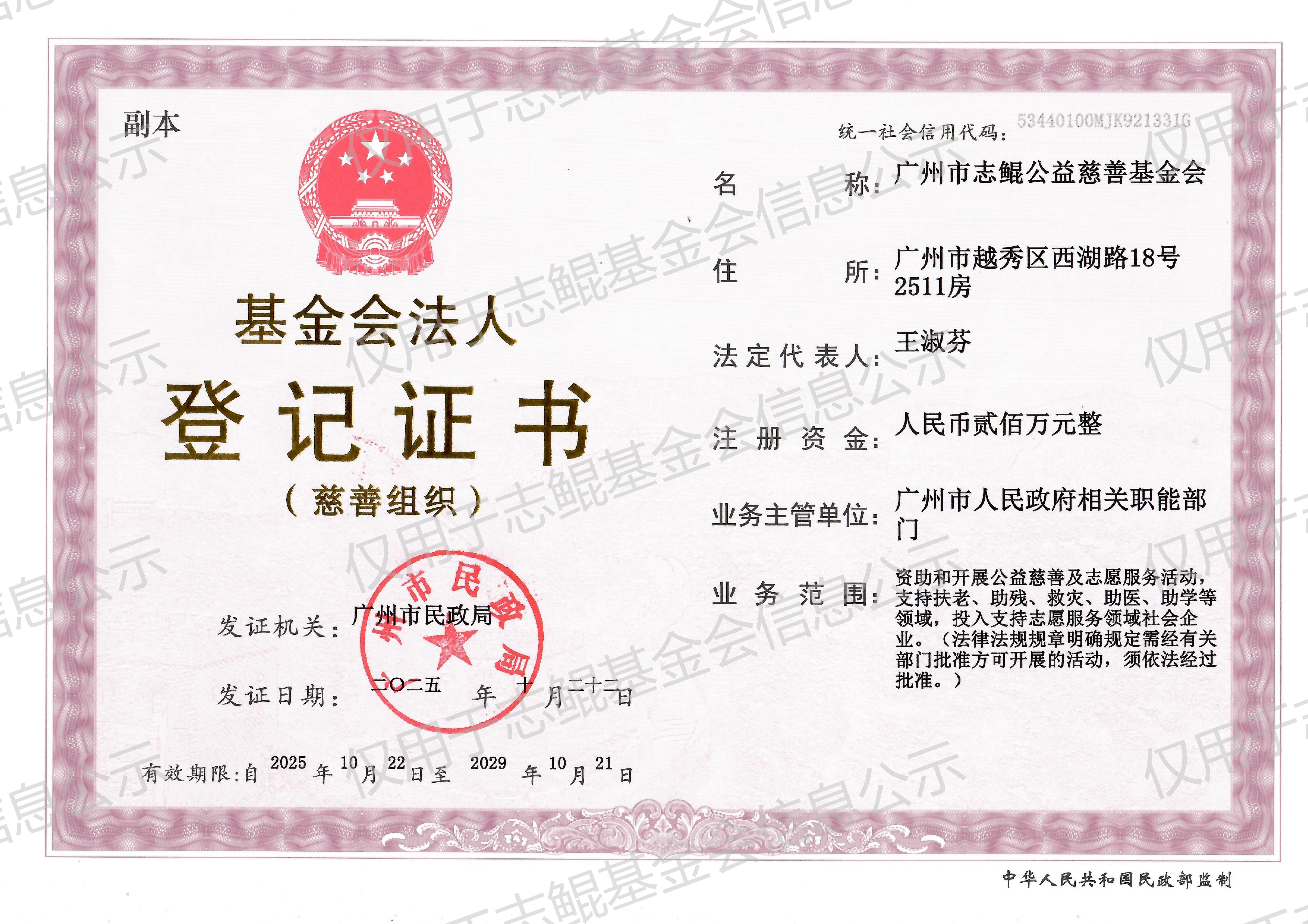 广州市志鲲公益慈善基金会于2018年在广州市民政局注册成立,于2025年1月2日获得“慈善组织公开募捐资格”,是公募基金会,基金会多年来坚持以“用公益打开自己、认识自己、喜爱自己”为导向,链接捐赠人与受益人,深耕儿童关爱、女性关怀、社区服务、志愿服务等领域,以实际行动推动广州市及全国公益慈善事业发展。