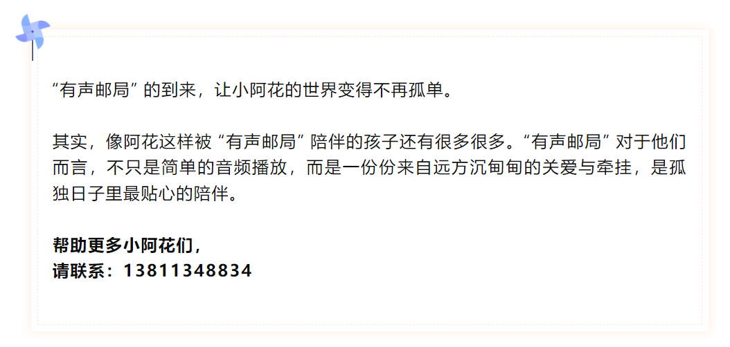 从此以后,阿花听着 “有声包裹” 里的故事入睡。她知道了原来在山的那边,还有很大很大的世界,有高楼大厦,有各种博物馆,还有很多很多有趣的事情。“有声邮局” 的声音,像一把钥匙,打开了阿花心中那扇向往外面世界的门。