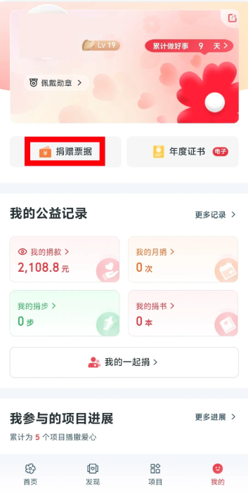 4.在个人中心页面,找到「捐赠票据」选项,点击进入开票管理页面;