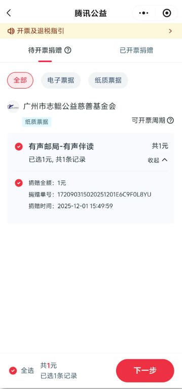 5.页面将展示12个月内的可开票捐赠记录,勾选需要开票的项目后,点击「下一步」;