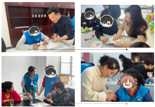 志愿者们分组与学员们共同活动:在小龄班,他们耐心陪伴孩子们一起制作贴纸故事书;在大龄学员的手工坊,大家则协力用针线缝合出精美的小马钥匙扣。