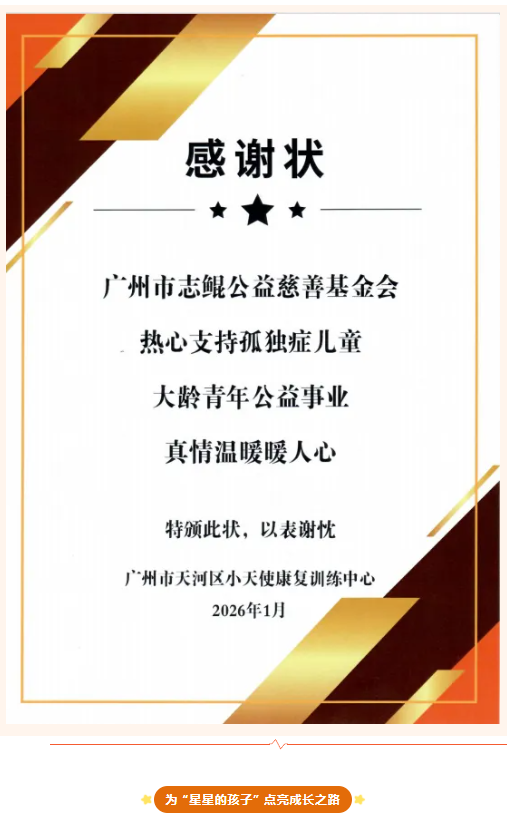 近日,广州市志鲲公益慈善基金会收到来自广州市天河区小天使康复训练中心的“感谢状”,这不仅是对志鲲的认可,也是我们继续深耕孤独症群体服务的激励。
